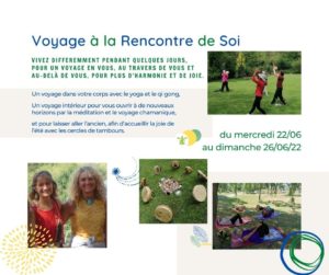 Un voyage dans son corps, ses formes, son espace, ses ressentis (Yoga, Qi-gong, ateliers divers…), un voyage intérieur pour s’ouvrir à de nouveaux horizons (relaxation, méditation, voyage chamanique…) Un voyage pour laisser glisser, couler au fil de l’eau l’ancien afin d’ accueillir la légèreté et la joie de l’été. (rituels, cercle de tambours, célébration du solstice d’été…) Un voyage dans la profondeur de notre cœur.